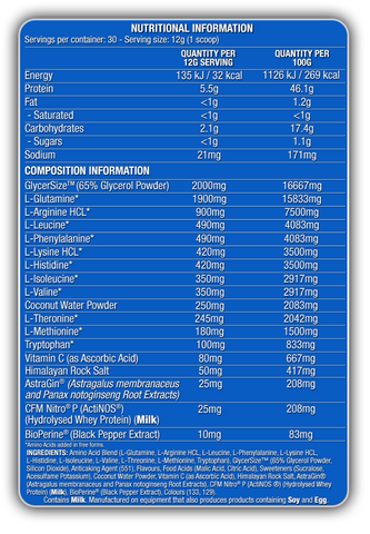 Pumping Aminos gives you an impressive combination of both essential amino acids and branch chain amino acids. EAAs and BCAAs are essential for you to increase protein synthesis and speed up recovery. Coconut water and taurine have been added for natural electrolytes and hydration, as well as several patented nitric oxide inducing ingredients for some crazy pumps and nutrient delivery. This product also maximises absorption by adding Astragin to increase the absorption of a wide range of nutrients including amino acids and nitric oxide ingredients. If you want to train at your best you have got to use the best!