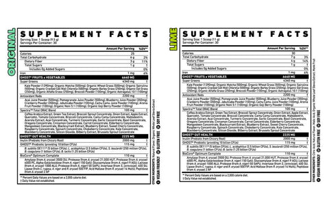 It's easier than ever to get your fruits and veggies in! Ghost Greens combines 19 individually sourced Greens and Reds with a full 100mg dose of Spectra™, Prebiotics, 10 billion CFU Probiotic and the super-premium BioCore® Optimum Complete Digestive Enzymes.