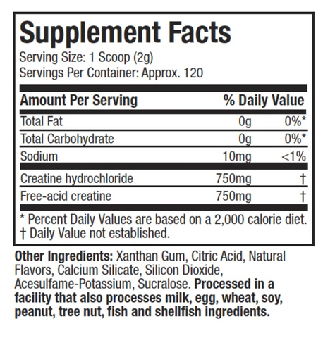 Muscletech Creactor is a clinically stuided advance creatine which delivers an amazing tasting product with a micro-dose of creatine HCI in which each serving delivers 750 MG of ultra pure 100% Creatine Hydrochloride (Creatine-HCI) plus an additional 750mg of Free Acid Creatine which is free from acids and salts I.E the purest form of creatine, according to muscletech this is a powerful never seen before ratio of creatine molcules which delivers an amazing creatine experiance.