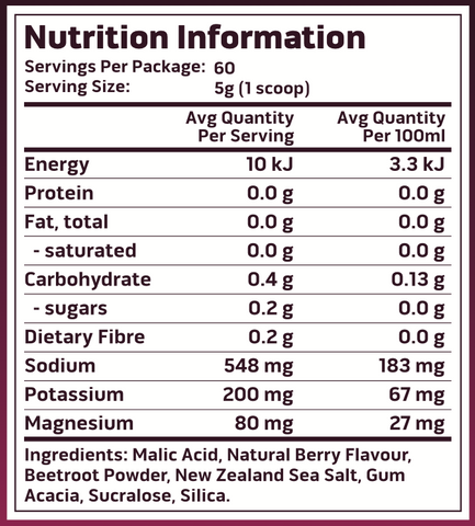 Because it’s packed with the essential minerals your body needs to stay hydrated and perform at its best. With 548mg of sodium, 200mg of potassium, and 80mg of magnesium per serving, our formula is designed to replenish the electrolytes lost during intense activities, keeping you fueled and ready for action. Plus, our clean and effective formula includes natural ingredients like New Zealand Sea Salt and Beetroot Powder, giving you a hydration boost you can feel good about.