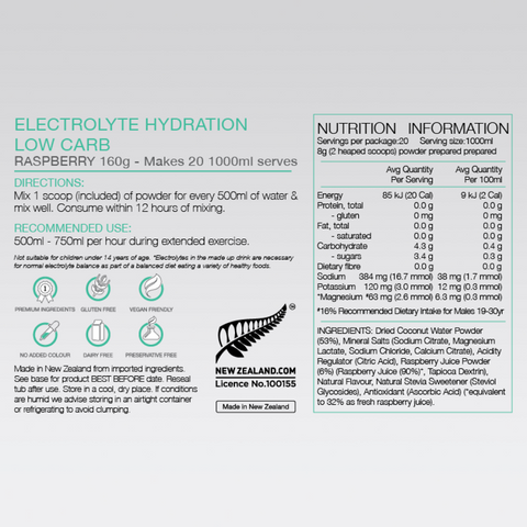 Pure Electrolyte Hydration Low Carb is designed to replenish electrolytes during hot conditions, sports and exercise. It contains real raspberry or lemon juice and a coconut water base, with no added sugars, colours or preservatives and is dairy-free, gluten-free, vegan-friendly and keto-friendly.