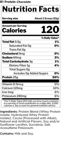 This protein formula is as pure as it gets. With 25g of protein and over 6g of BCAAs — entirely from intact and hydrolyzed whey protein isolates — R1 Protein helps support the recovery and growth aspirations of the most ardent muscle builders.