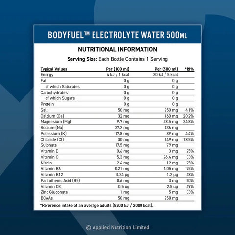 APPLIED NUTRITION BODY FUEL ELECTROLYTE WATER 500ML - 12 PACK - DATED 1/25