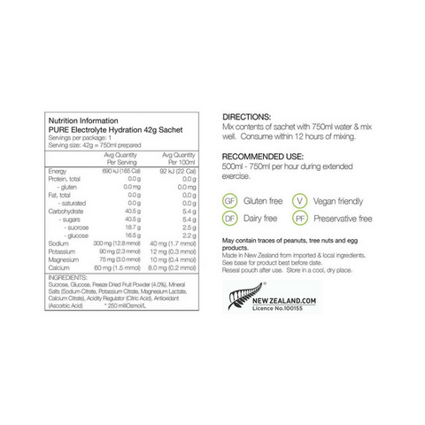 PURE Electrolyte Hydration is best used when exercising over one hour or short high intensity exercise. It provides fluids, electrolytes and energy.