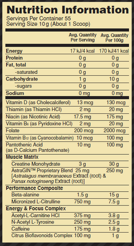 Pre-Workout is also made with only premium ingredients, including CarnoSyn Beta-Alanine which supports your intramuscular buffering system to help you train harder, longer and Creapure Creatine Monohydrate.