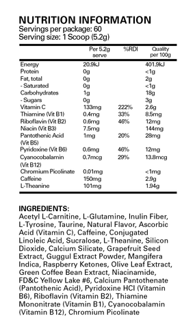 Huperzone A has also been added, which is a supplement that dials up your focus levels, cognitive abilty, mental clarity and blood flow to the brain. This is especially effective when combined with the taurine, tyrosine and Acetyl L-Carnitine in Oxyshred, which works in synergy to promote mood elevation and cognition boosts during a caloric defecit diet (which is when dieters usually experience low energy, moodiness, brain fog and lethargy).